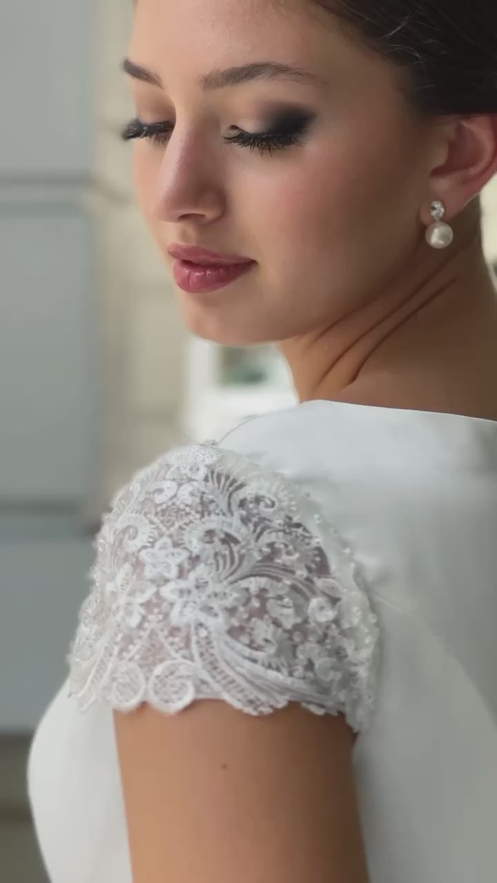 Cindy is a timeless and elegant A-line silhouette gown featuring delicate lace cap sleeves and an elegant boat neckline. This gown has been carefully crafted with sleek satin, making it the perfect way to make a minimalistic statement on your special day. With bridal buttons along its high back all the way down to the cathedral length train, you will be sure to make a lasting impression.