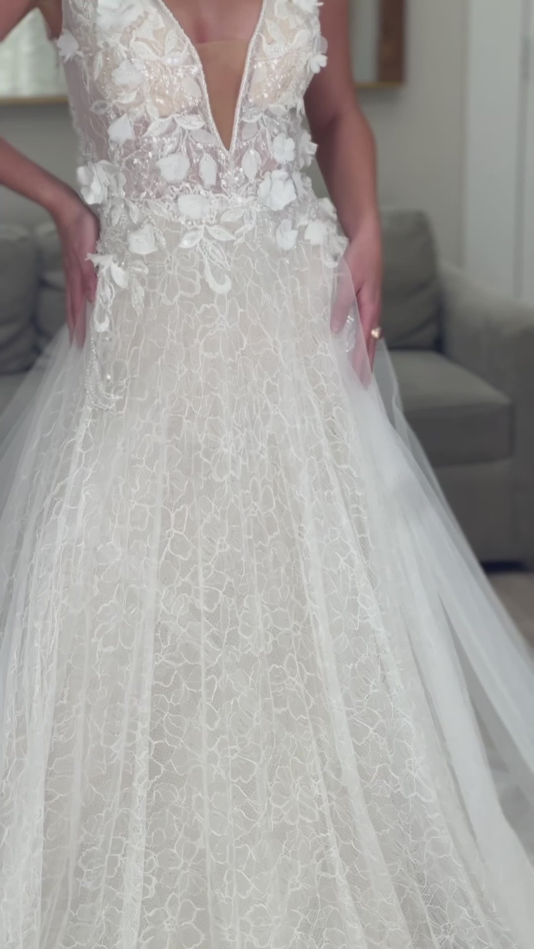 Meet Jane, a captivating a-line silhouette lace gown featuring enchanting 3-D lace cap sleeves and a nude lining. The intricate floral lace detailing creates a romantic and ethereal style. With a flattering v-neckline, a breathtaking cathedral length train, and delicate beaded and 3-D lace embellishments, Jane is the epitome of elegance and grace.