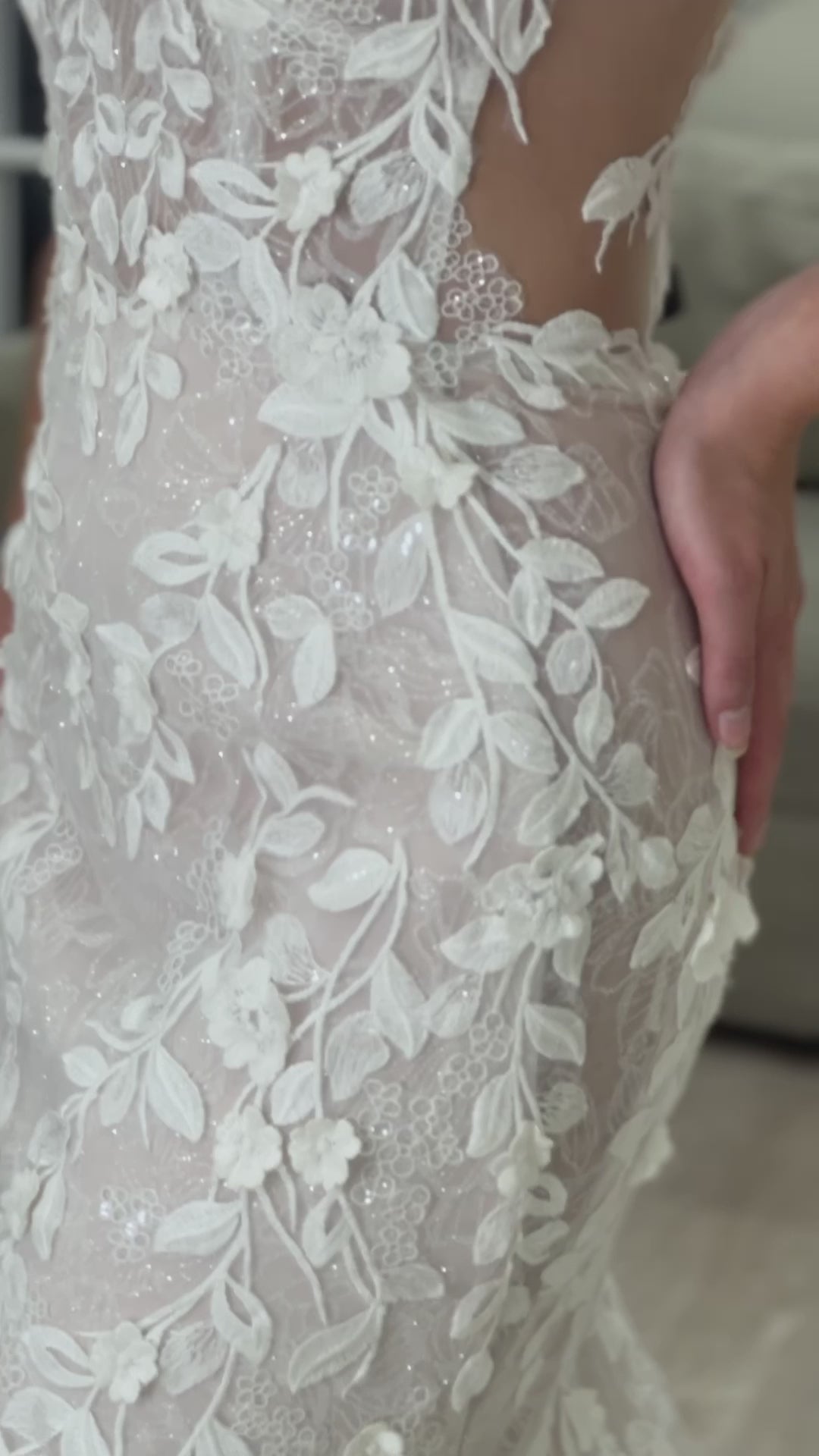 Introducing Megara - the ultimate mermaid silhouette gown for the romantic and daring bride. This stunning dress features beautiful embroidered lace throughout, adding a touch of bold elegance to your wedding day look.