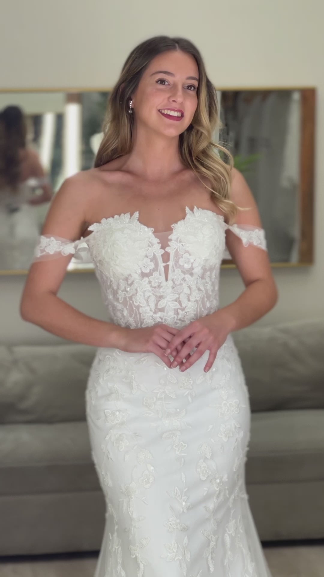 Experience modern elegance with ARIEL. The off-the-shoulder straps and plunging sweetheart neckline add a romantic touch, while the sheer, beaded lace and bridal buttons elevate the look. Complete with a stunning cathedral train, ARIEL is the perfect blend of modern and romantic for your special day.