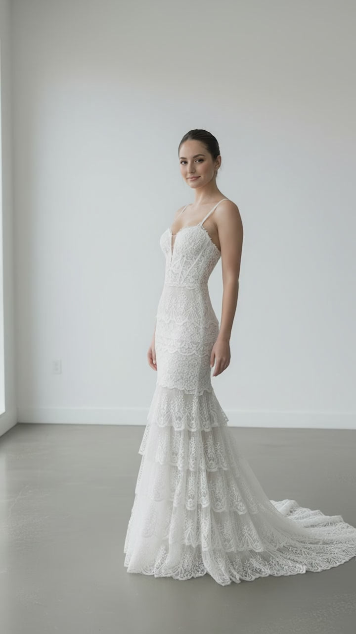 Maddie features a bustier paired with a flared mermaid silhouette, rendered in vintage natural white lace. This design merges architectural tailoring with romantic detailing, offering both support and graceful movement. The lace fabrication brings refined texture to the piece, while the mermaid cut delivers a sophisticated transition from fitted bodice to flowing skirt.